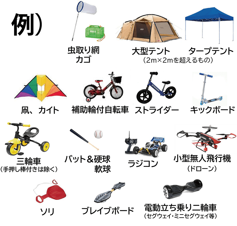 当公園では持込み禁止物を定めております。公園内で以下の物品の持込みや使用を確認した場合、ご退園までの間、預からせていただきます。
