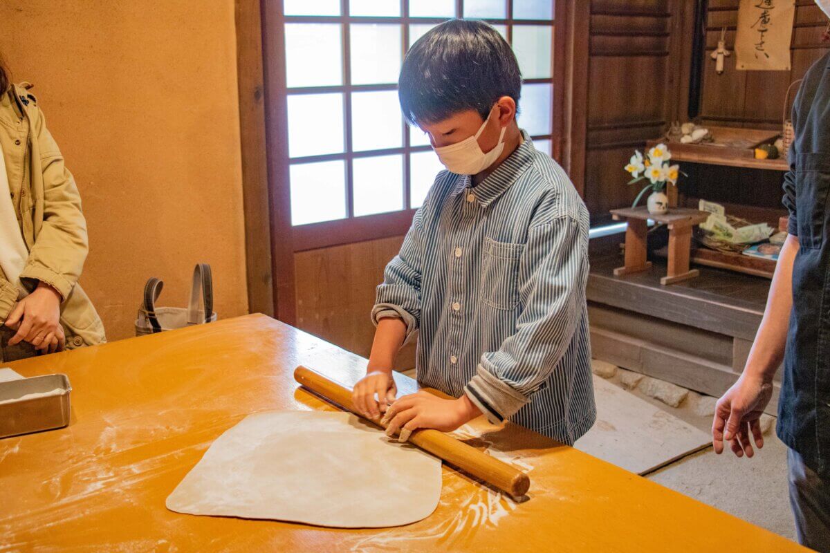 地元庄原市一木町産のそば粉を使って作る手打ちそばづくりです。